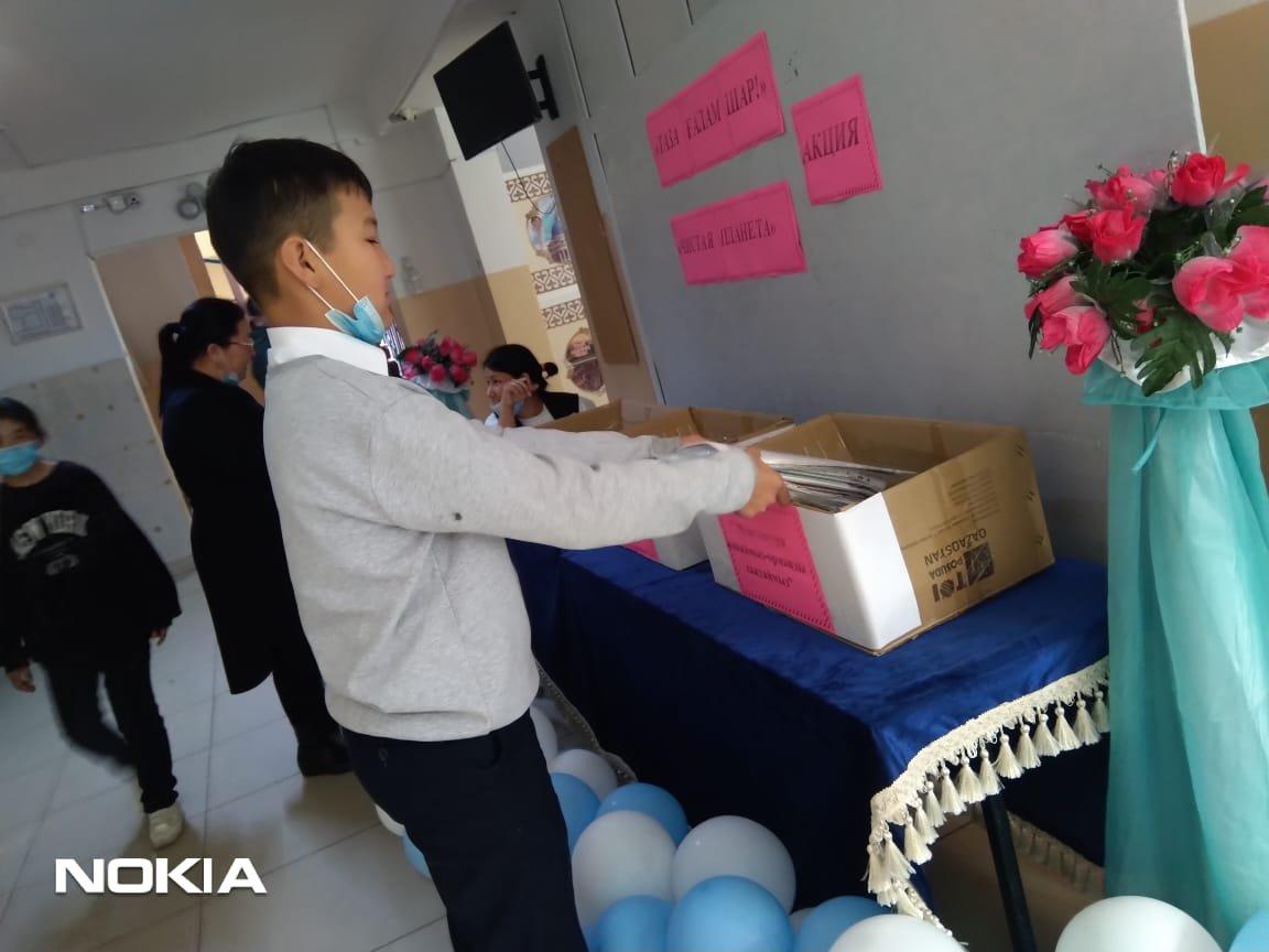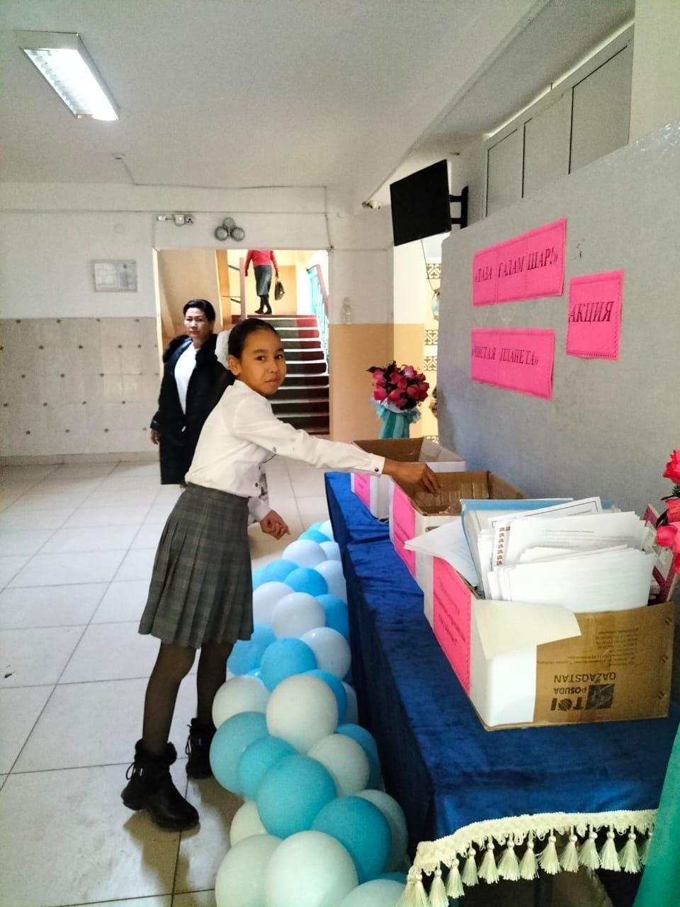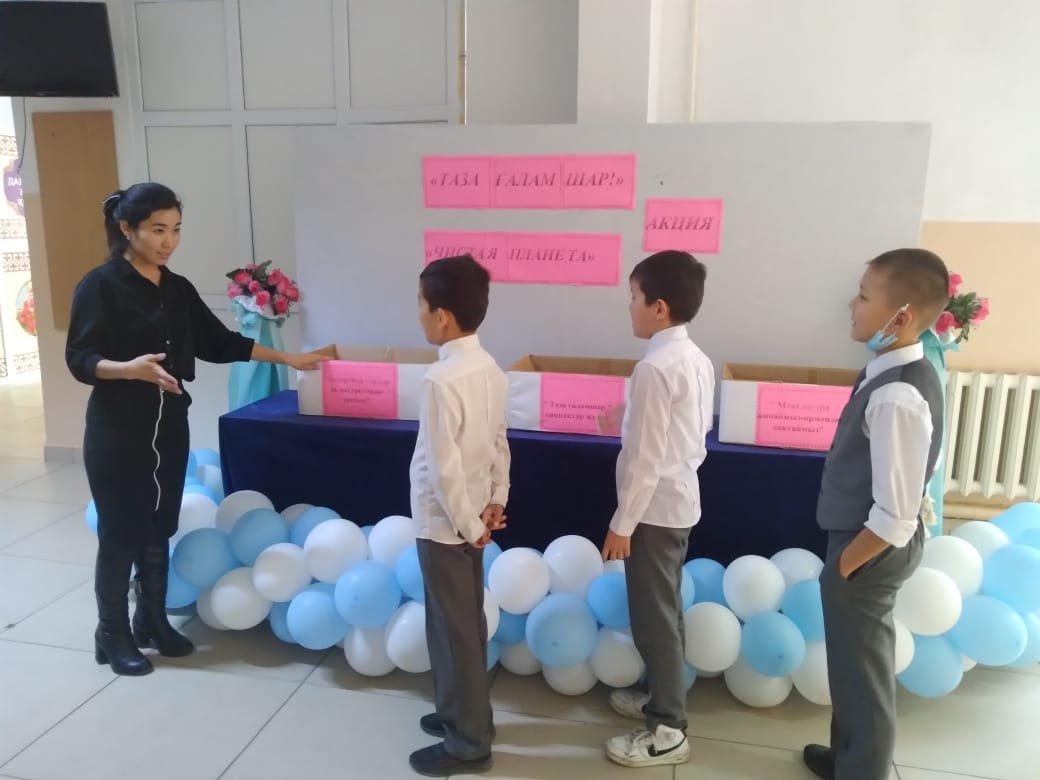 Шығармашылық қабілеттерін жақсылық жасай білу іскерліктерін, ойлау қабілетін дамыту, өз ойын еркін жеткізе білуге дағдыландыру"Таза ғаламшар" табиғатты тазалау, қалған қалдықтарды жинақтау акциясы аясында мектебіміздің 5-10 сынып оқушылары арасында "Таза ғаламшар" қақпақтар жинау, "Макулатура жинаймыз-орманды сақтаймыз", "Батарейка тапсыр да, ресурстарды үнемде" 8 қараша күнінен бастап, 12 қараша аралығында акция өткізілді. Оқушылар кардон қағаздардан "Small робот" жасап, оқушыларға таныстырды. 5 "З" сыныбының Жұмабай Ердаулет өзінің тапқырлығымен, батарейка және қағаз қалдықтарын құрастырып, робот ойлап жасады. 9 сынып оқушылары 5 және 6 сынып оқушыларымен бірігіп, қағаз жинау жұмысына ат салысты. Таза табиғат-жер анамыздың көркі.