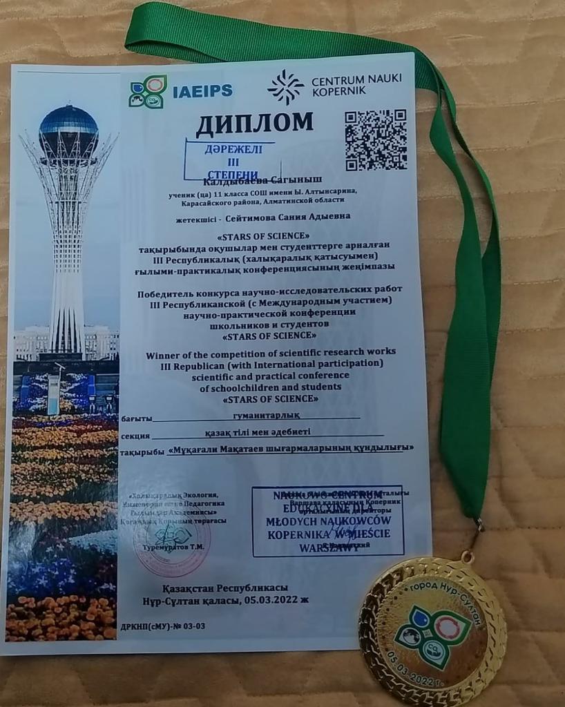 «STARS OF SCIENCE» тақырыбындағы оқушылар мен студенттерге арнлған ІІІ Республикалық (халықаралық қатысуымен) ғылыми-практикалық конференциясының жеңімпазы Калдыбаева Сағыныш ІІІ дәрежелі димлом алғаны үшін марапатталады. Жетекшісі: Сейтимова С.А.