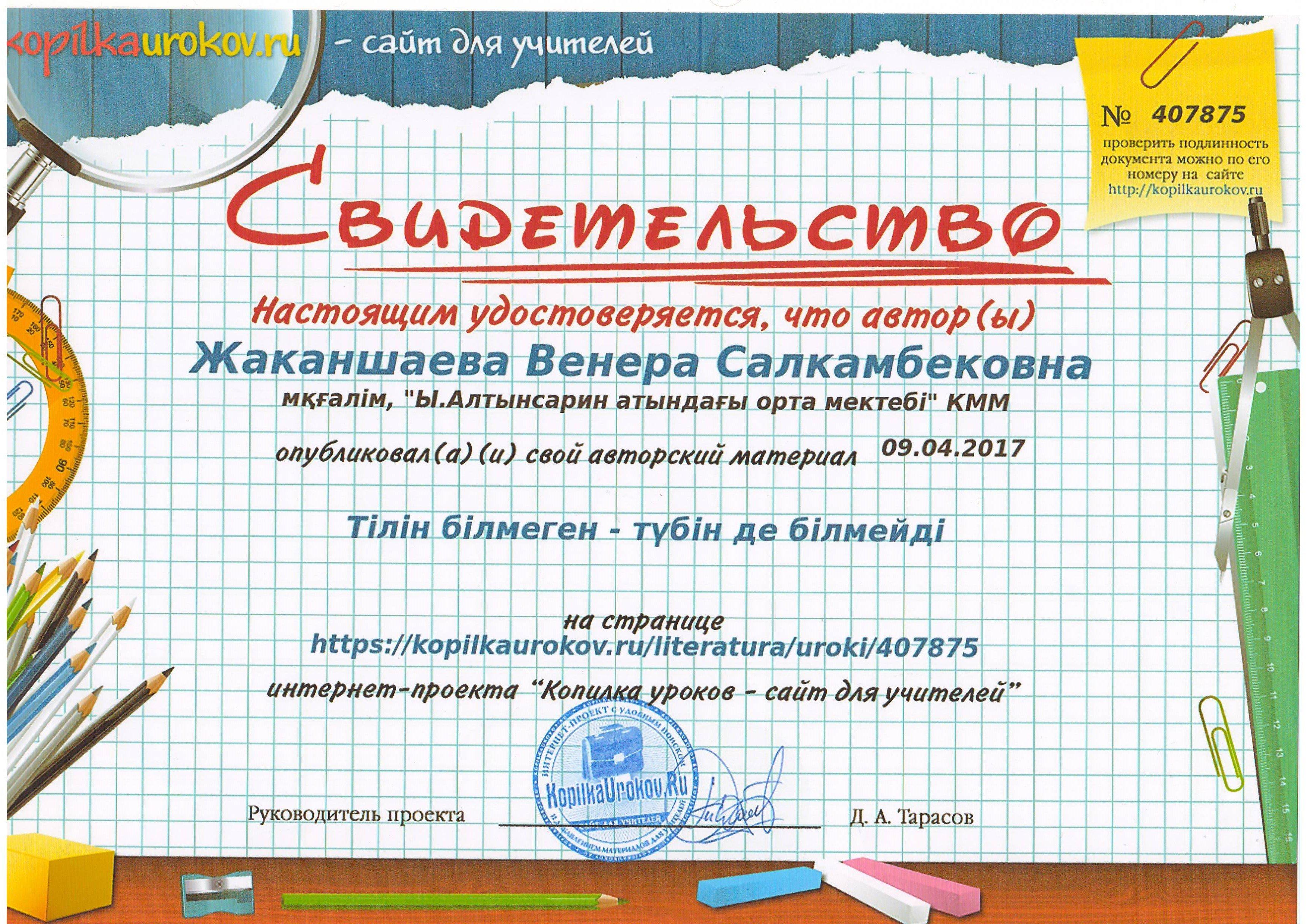 свидетельство » Ыбырай Алтынсарин атындағы орта мектебі