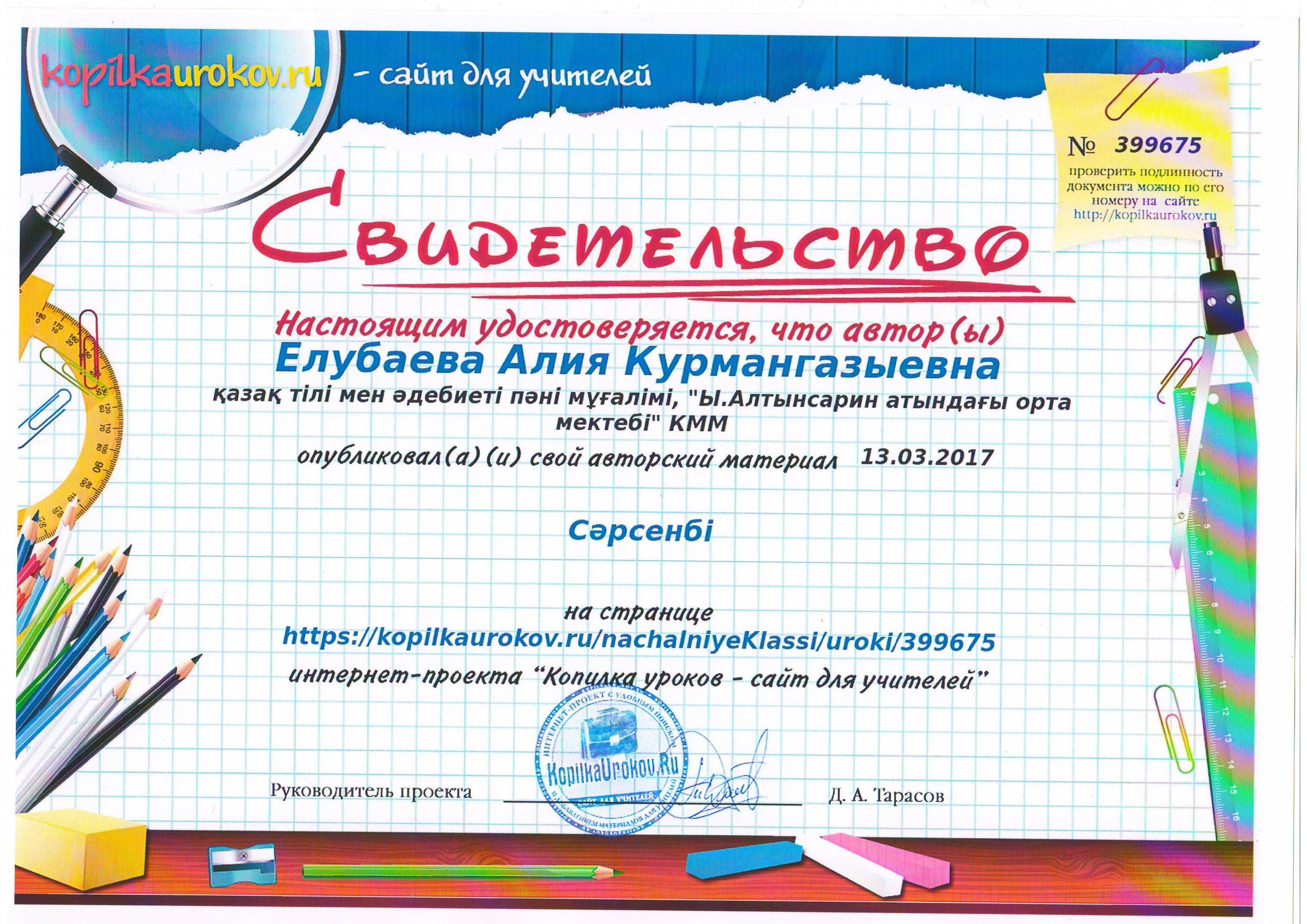 свидетельство » Ыбырай Алтынсарин атындағы орта мектебі