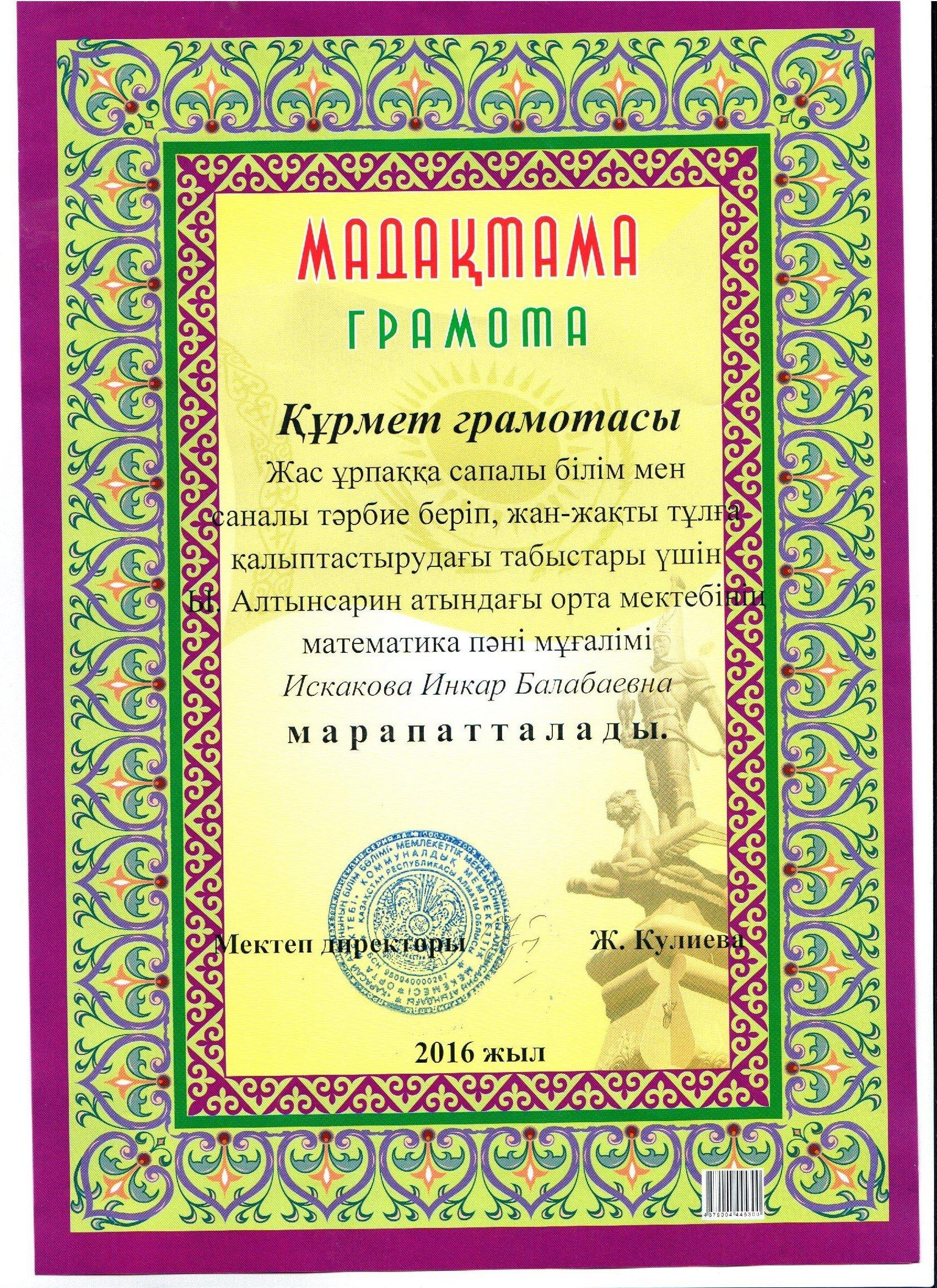 Мақтау қағазы » Ыбырай Алтынсарин атындағы орта мектебі
