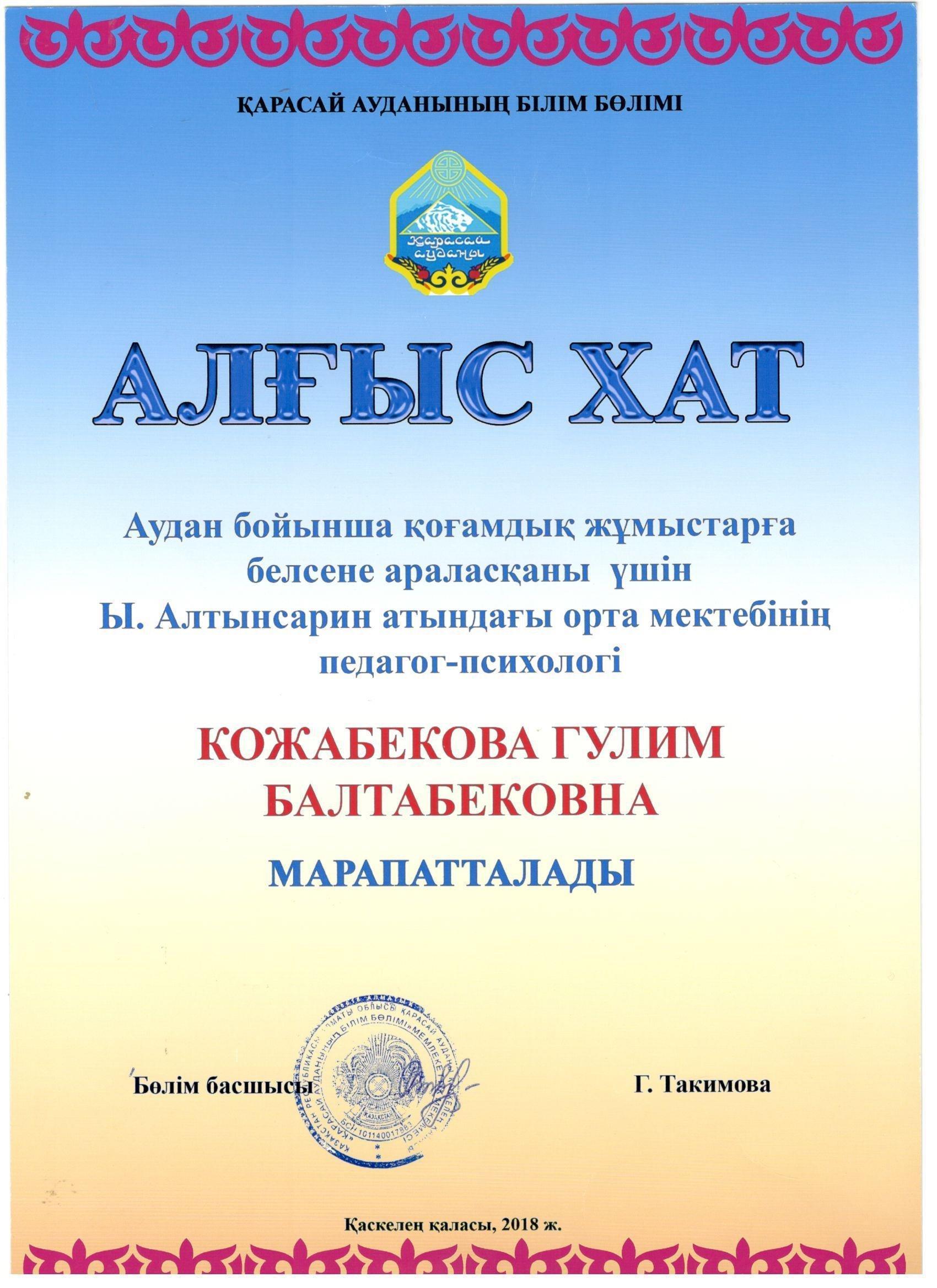 Алғыс хат » Ыбырай Алтынсарин атындағы орта мектебі
