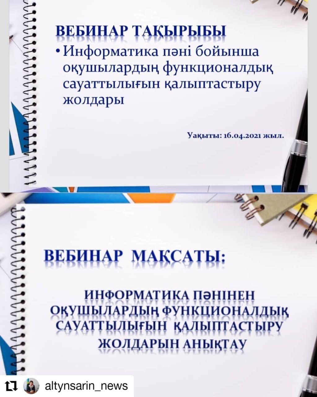 «Ізденіс» кафедрасы физика –информатика бірлестігі мұғалімдері 16.04.2021ж. күні «Информатика пәнінен оқушылардың функционалдық сауаттылығын қалыптастыру» тақырыбында ZOOM платформасы арқылы аудандық вебинар өтті. Вебинарды ДӘІЖО Топашова Т.Н. алғы сөз сөйледі.