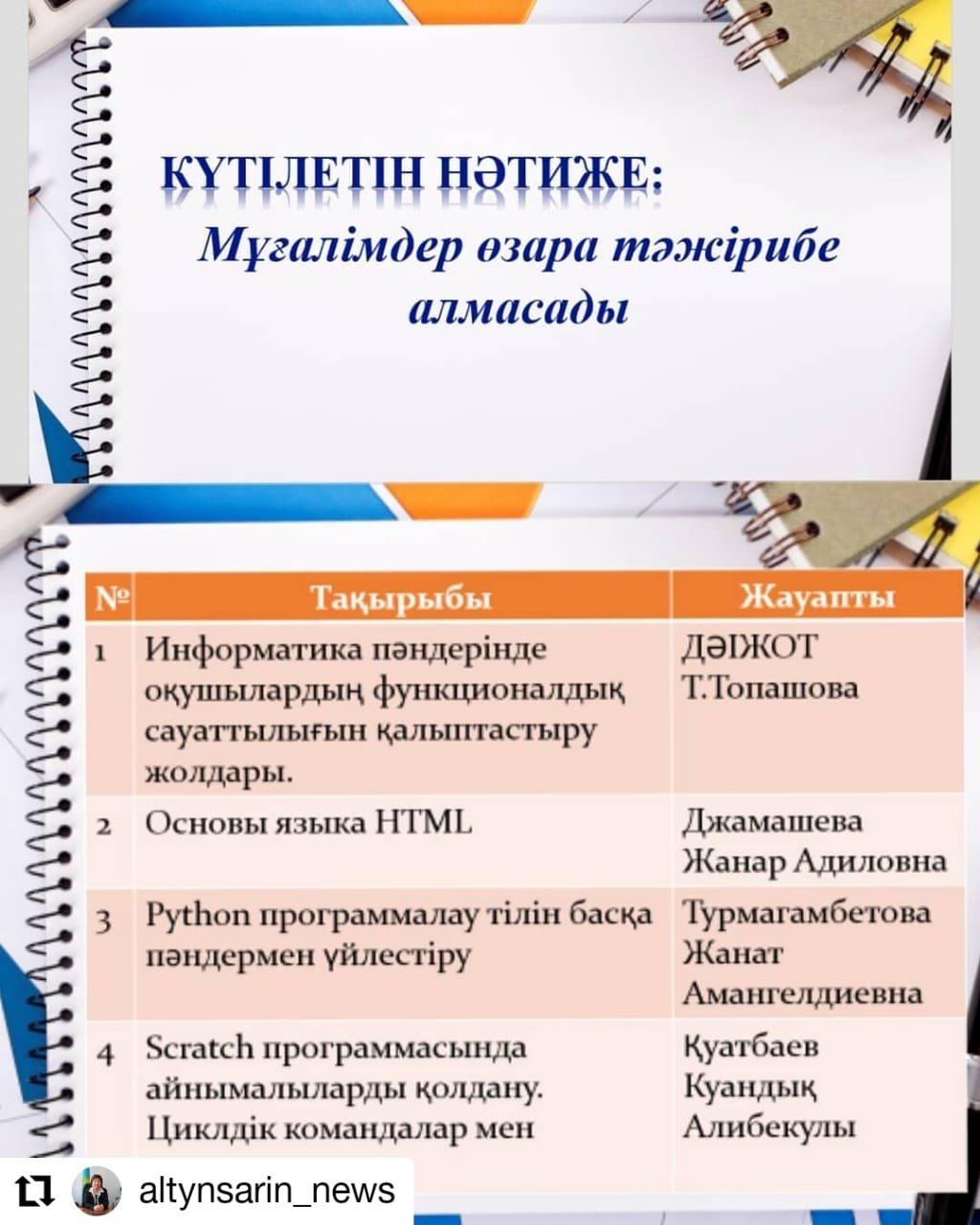 Бірлестік жетекшісі Жуманиязова М. «Информатика пәнінен оқушылардың функционалдық сауаттылығын қалыптастыру жолдары» тақырыбын слайд арқылы таныстырып өтті. Информатика пәні мұғалімі Джамашева Жанар «Основы языка HTML» тақырыбында өз іс-тәжірибесімен бөлісті. Информатика пәні мұғалімі Турмагамбетова Жанат «Python программалау тілін басқа пәндермен үйлестіру» тақырыбы бойынша алгебра, физика және Қазақстан тарихы пәндерімен үйлестіріп есептер шығару бойынша өз тәжірибесін ой бөлісті.