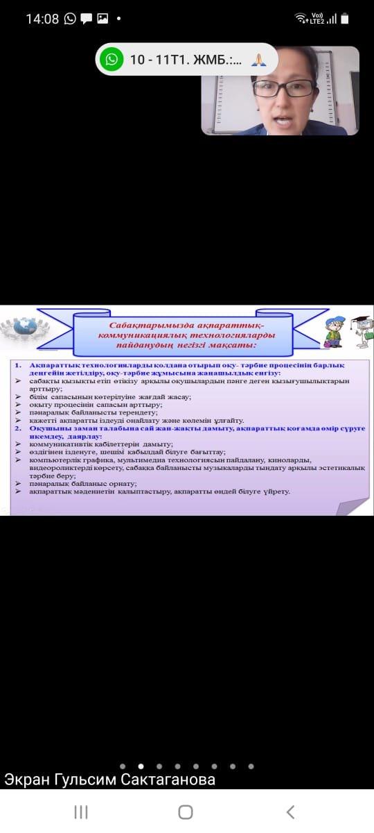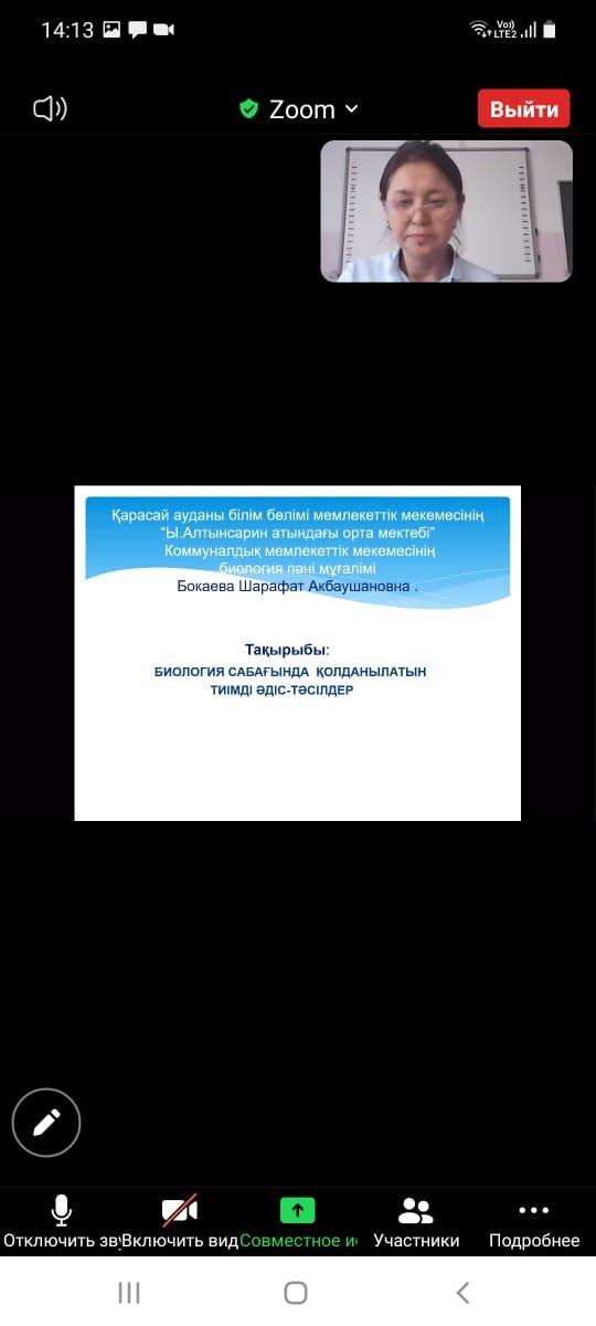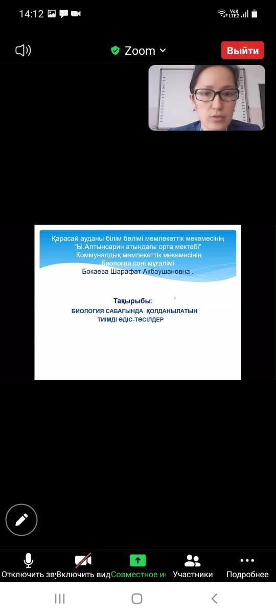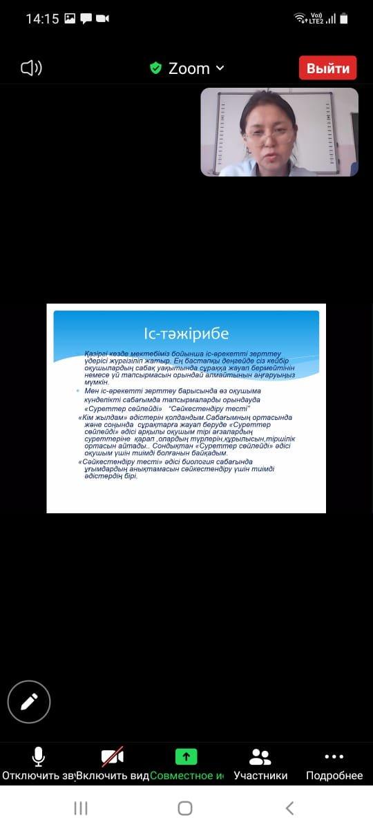Мектепішілік «Қашықтықтан оқыту кезеңінде оқушылардың қызығушылығын арттыру мақсатында география, химия және биология сабақтарында инновациялық технологияларды қолдану» тақырыбында қашықтықтан ZOOM платформасымен өткізілген вебинар 26.04.2021жыл.