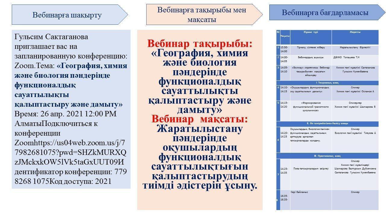 Вебинар мақсаты: Жаратылыстану пәндерінде оқушылардың функционалдық сауаттылықтығын қалыптастырудың тиімді әдістерін ұсыну.
