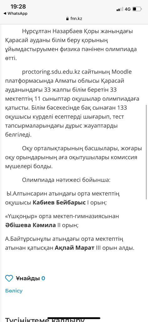 Қарасай ауданы білім беру қорының ұйымдастыруымен өткен физика пән олимпиадасынан 11 сынып оқушысы Кабиев Бейбарс 1орын алды,пән мұғалімі Есенжулова Айман құтты болсын,биіктен көрініңіздер,Ылтынсарин ізбасарлары тек жеңіске жете берсін,құттықтаймыз!