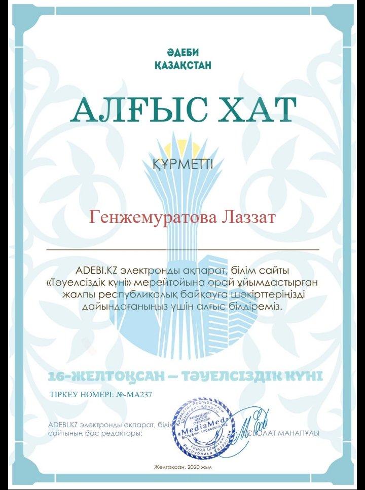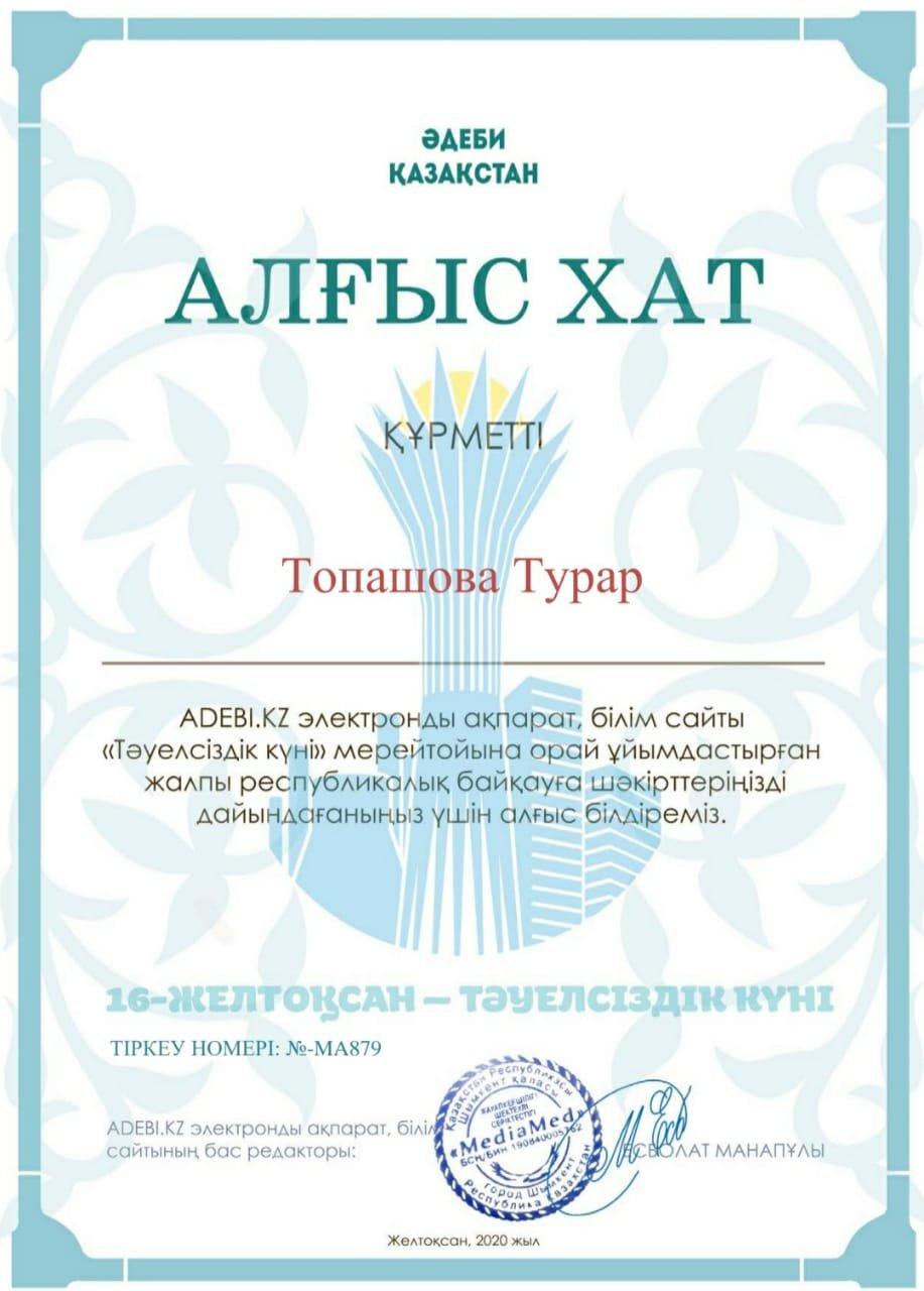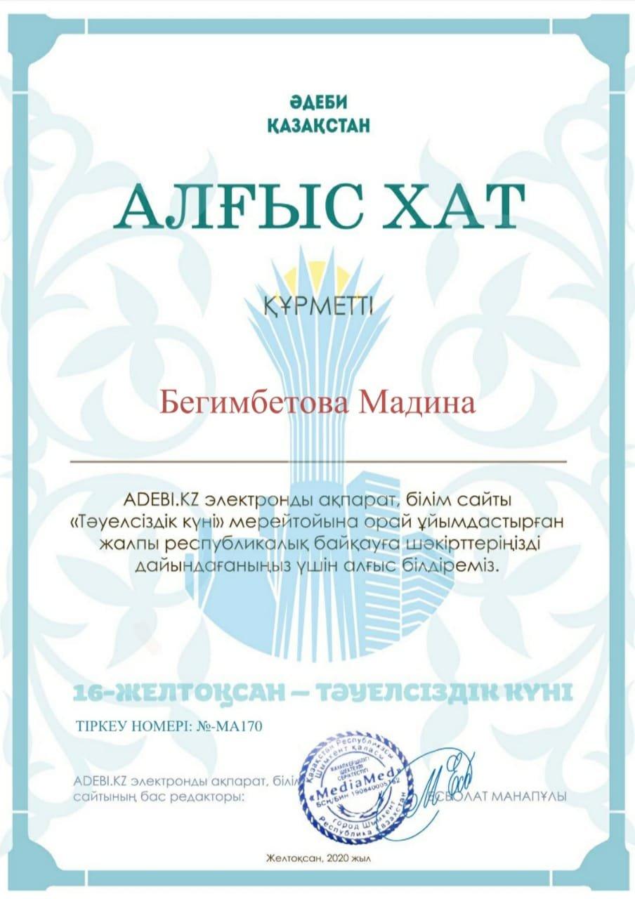 Мұғалімдер жетістігі 13.12-15.12 .2020 жыл » Ыбырай Алтынсарин атындағы орта мектебі