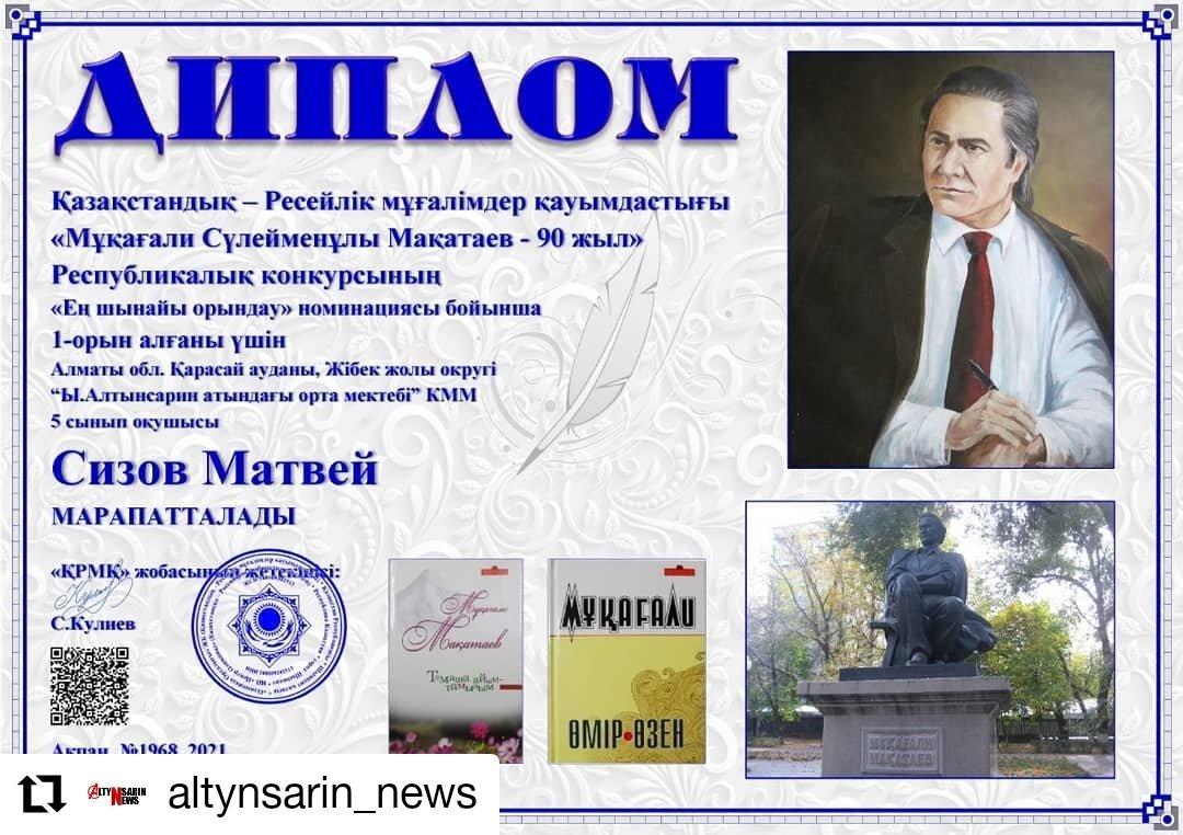 Қазақстандық -Ресейлік мұғалімдер қауымдастығы "Мұқағали Мақатаев - тоқсан жыл респубдикалық конкурсына орыс бесінші сынып оқушылары Сизов Матвей,Никита Маргарита қатысып дипломмен марапатталып бірінші орын алды,пән мұғалімі Кармысова Кансулу еңбектеріңіз жана берсін,осындай дарынды оқушыларыңыз көп болсын.Құттықтаймыз!.