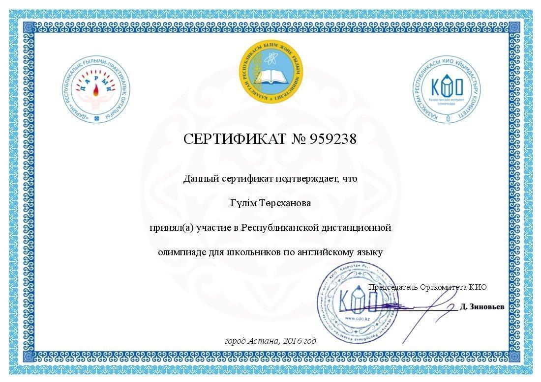 Сертификат Төреханова Гүлім » Ыбырай Алтынсарин атындағы орта мектебі